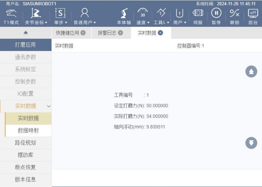 ● 实时显示刀具 ID、设定/实际力和浮动值。