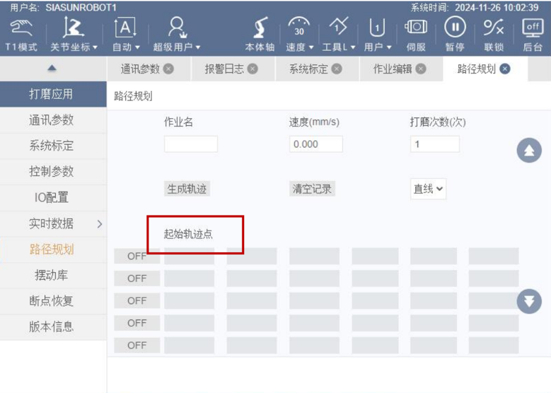 ● 如果机器人的研磨过程因警报或其他原因停止,研磨机器人程序可以在重新启动时通过在断点附近执行断点恢复功能来恢复间歇研磨。