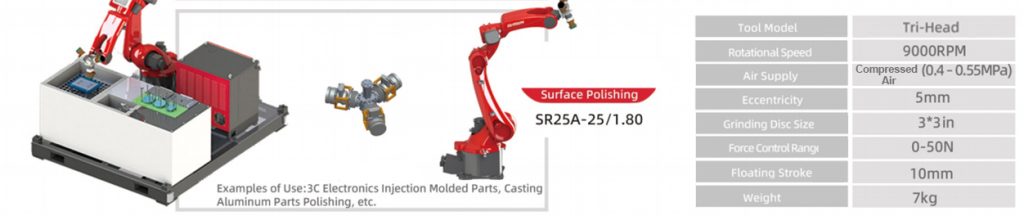 | 力控磨削工具系统 | M5305R25GF2-01 | 浮动式力控制系统,带控制器和通讯电缆; 浮动行程:25mm,力控制范围:0–300N,负载能力:14kg; 单输出主轴,自动换刀,1.3kW,6000rpm; 包含变频器和主轴刀架(兼容角磨机工具和海绵垫)。 | 1 |