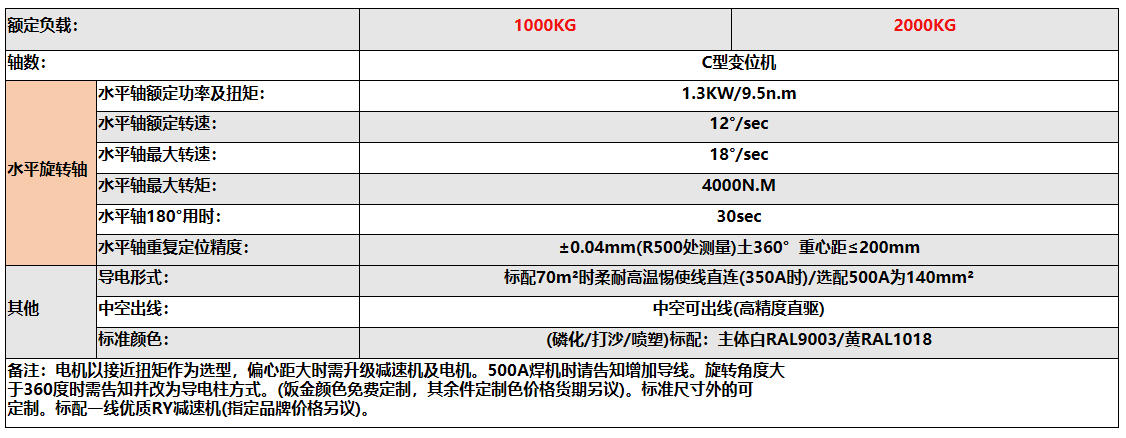 | 笔记 | 电机选型基于近似扭矩;对于较大的偏心距,减速器和电机都需要升级。请告知我们500A焊机的额外接线需求。对于大于360°的旋转角度,请告知我们并更换为导电柱系统。(金色定制免费;其他部件的定制颜色和交货时间可协商)。标准尺寸范围之外的尺寸可定制。标准配置包含一个高品质的RY减速器(指定品牌的价格可协商)。 | |