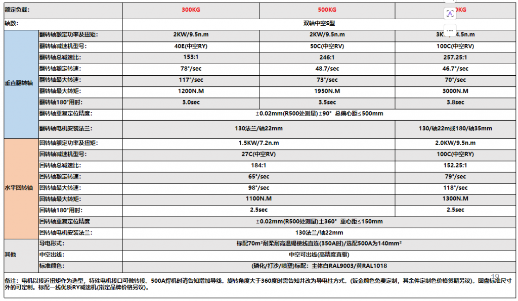 | 笔记 | 电机选型基于近似扭矩;特殊电机接口可进行适配。使用500A焊机时,请告知我们额外的接线需求。旋转角度大于360°时,请告知我们并更换为导电柱连接方式。(金色定制免费;其他部件的定制颜色和交货时间可协商)。标准尺寸以外的圆盘可定制。标准配置包含一个高品质RY减速机(指定品牌价格可协商)。 | ||