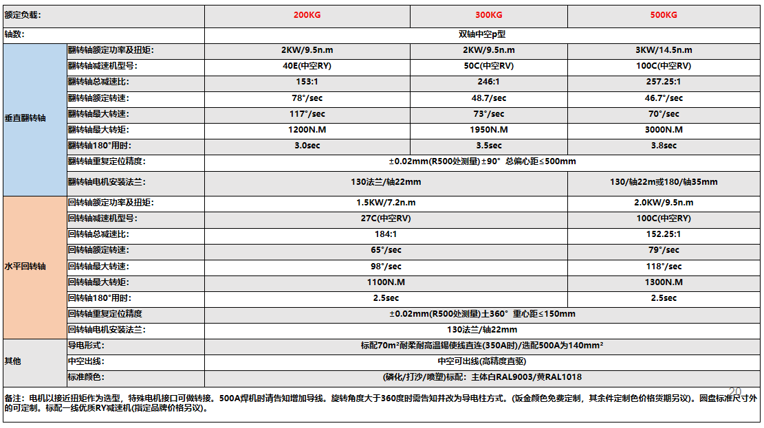 | 笔记 | 电机选型基于近似扭矩;特殊电机接口可进行适配。使用500A焊机时,请告知我们额外的接线需求。旋转角度大于360°时,请告知我们并更换为导电柱安装方式。(金色定制免费;其他部件的定制颜色和交货时间可协商)。标准尺寸以外的圆盘可定制。标准配置包含一个高品质RY减速机(指定品牌价格可协商)。 | ||