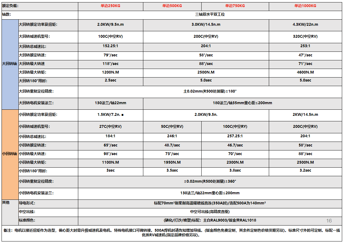 | 笔记 | 电机选型基于近似扭矩;对于较大的偏心距,减速器和电机都需要升级。可适配特殊电机接口。使用500A焊机时,请告知我们额外的接线需求。(钣金颜色定制免费;其他部件的定制颜色和交货时间可协商)。非标准尺寸可提供定制尺寸。标准配置包含顶级高品质房车减速器(指定品牌的价格可协商)。 | |||